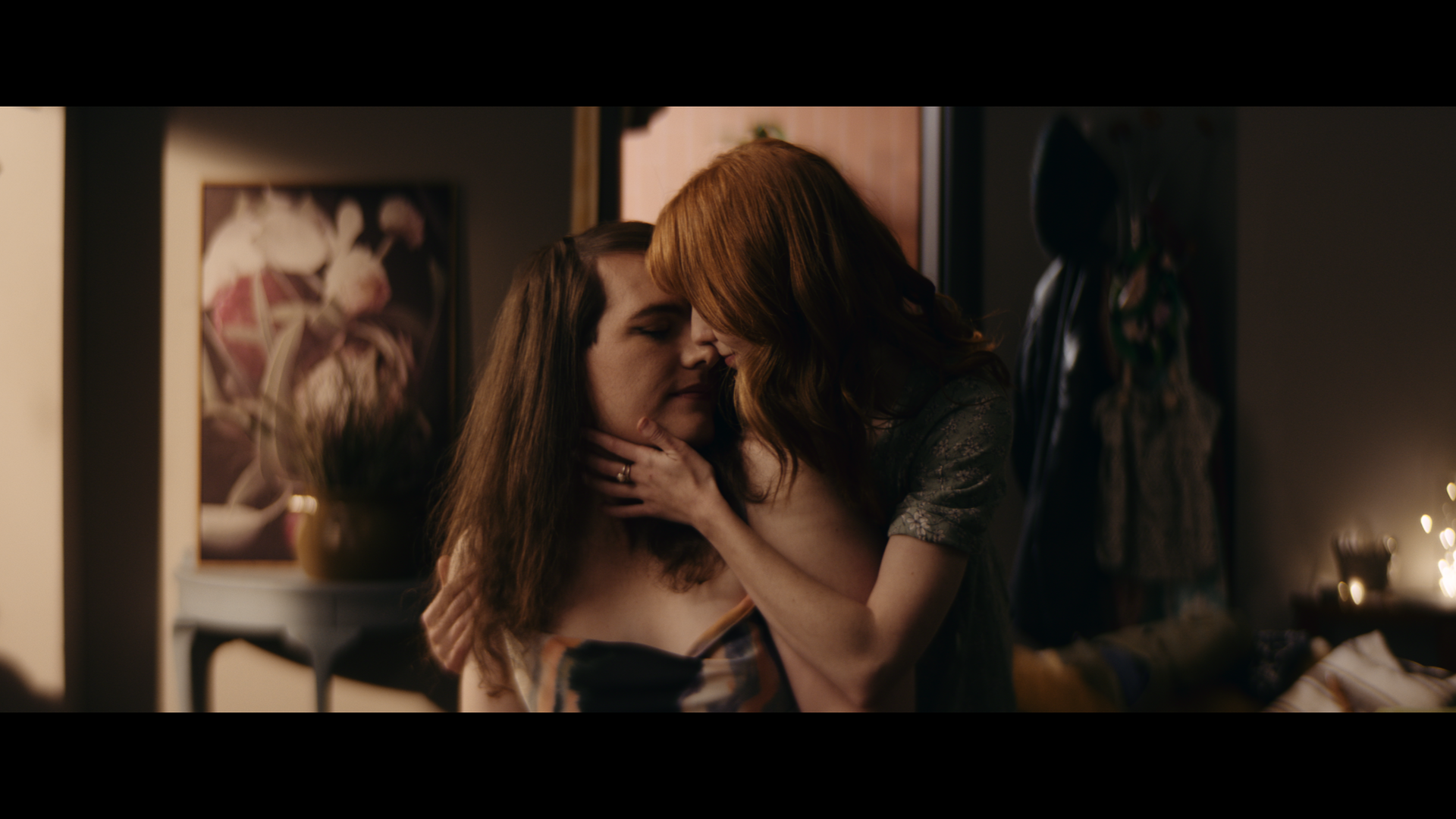 In both frames where Tessa and Elle have their moments together, we can see the role both falloff and shallow depth of field play in creating both isolation and intimacy between the two characters. I believe that these scenes would have been perfectly adequate without the lens characteristics due to these moments being the climax’s of their respective scenes. However, I can’t help but think that these characteristics helped emphasise the tenderness of this intimate moment. It was also the lenses that informed the lighting for these scenes, as I hoped to bring out this patina for special moments.